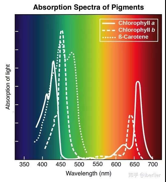 两种叶绿素(叶绿素a和叶绿素b)的吸收光谱相似,但也有所差异:首先叶绿素a在红光部分的吸收带宽些,在蓝紫光部分窄些,而叶绿素b在红光部分的吸收带窄些,在蓝紫光部分宽些;其次,与叶绿素b比较,叶绿素a在红光部分的吸收带偏向长波方向,而在蓝紫光部分则偏向短波方向。胡萝卜素和叶黄素的吸收光谱与叶绿素不同,他们的很大吸收带在蓝紫光部分,不吸收红光等长波的光。因此要想植物的光合作用正常进行,光谱就必须满足光合色素的吸收波段。