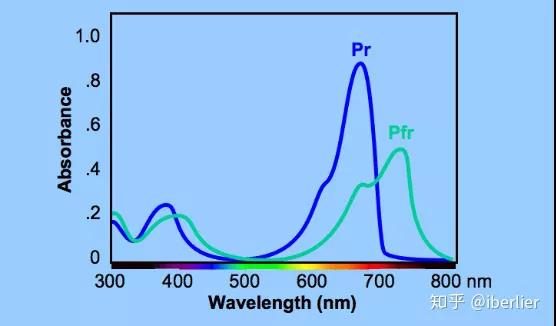 光敏色素分为红光吸收型(Pr)和远红光吸收型(Pfr)两种类型。两者的光学特性不同,Pr的吸收高峰在660nm,Pfr的吸收高峰在730nm。Pr和Pfr在不同光谱作用下可以相互转换。当Pr吸收660nm红光后,就转变为Pfr,而Pfr吸收730nm远红光后,会逆转为Pr。