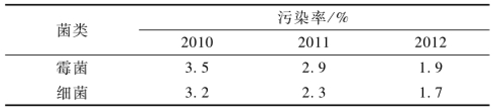 由表4可知,与2010年相比,2012年金线莲组培苗细菌污染下降率为1.5百分点,霉菌污染下降率为1.6百分点。艾叶与苍术联合熏蒸法对金线莲组培生产空气灭菌效果较佳,适用于金线莲组培苗工厂化生产。