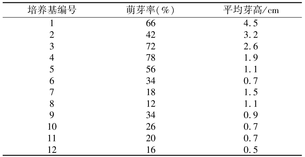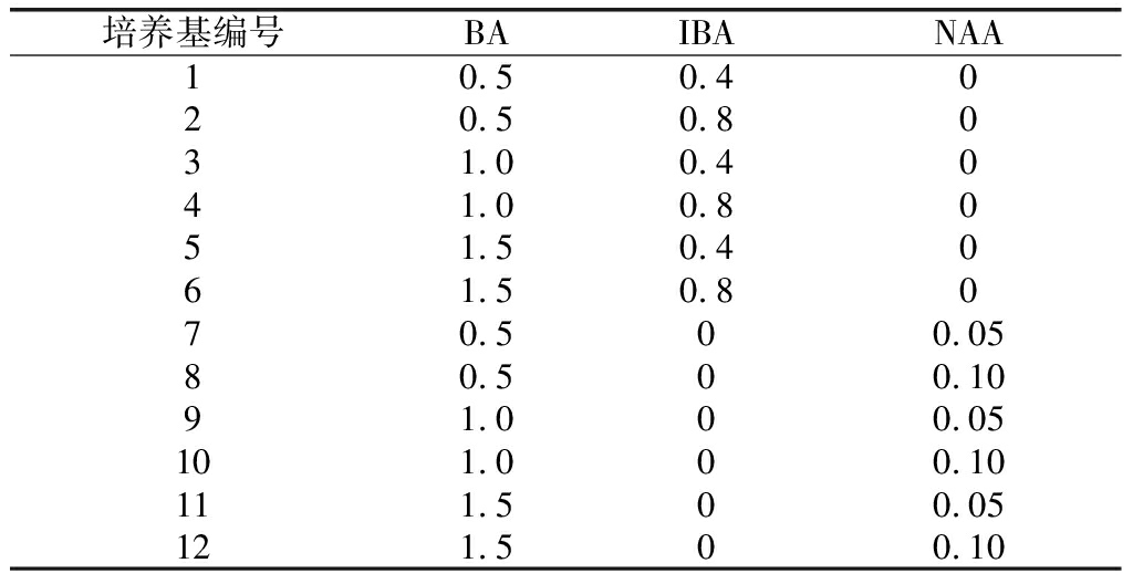 以MS为基本培养基,添加不同质量浓度的激素(BA、IBA及NAA)配制12个配方的诱导培养基(表1)。在无菌环境中将消毒后的外植体切取腋芽,接种于诱导培养基上,每个配方接种50瓶,每瓶1个外植体,20d后统计其萌芽率,40d后统计腋芽生长高度。