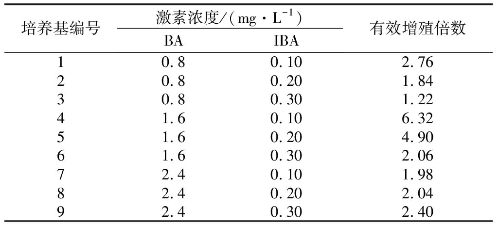 待腋芽长到1.0cm以上时,将其从基部剪开,剪成1.0~2.0cm的单株小芽,转接到以MS为基本培养基,添加不同质量浓度的激素(BA、IBA)配制的9个配方的增殖培养基上(表2)。每个组合接种50瓶,每瓶1个嫩芽,40d后统计其增殖率。
