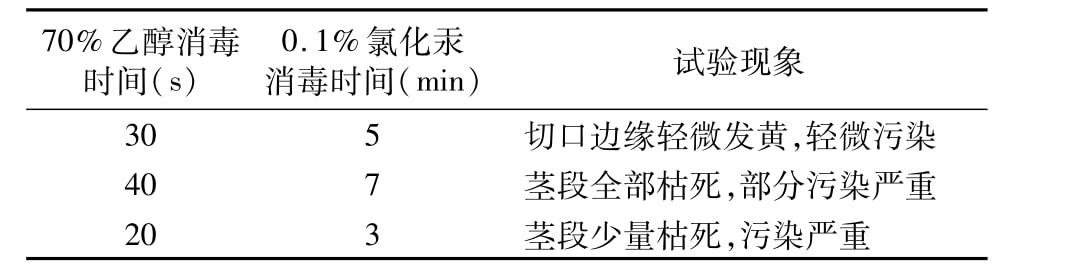 从表2可以看出,70%乙醇30 s、0.1%氯化汞5min的消毒效果佳。氯化汞本身是剧毒品,尽管使用时稀释到很低的浓度,对于植物细胞来说还是有很大伤害,所以其清洗时间不宜过久,但时间过短又达不到消毒的效果。每次氯化汞消毒完毕,要用无菌水冲洗5次左右,保证外植体清洗干净。