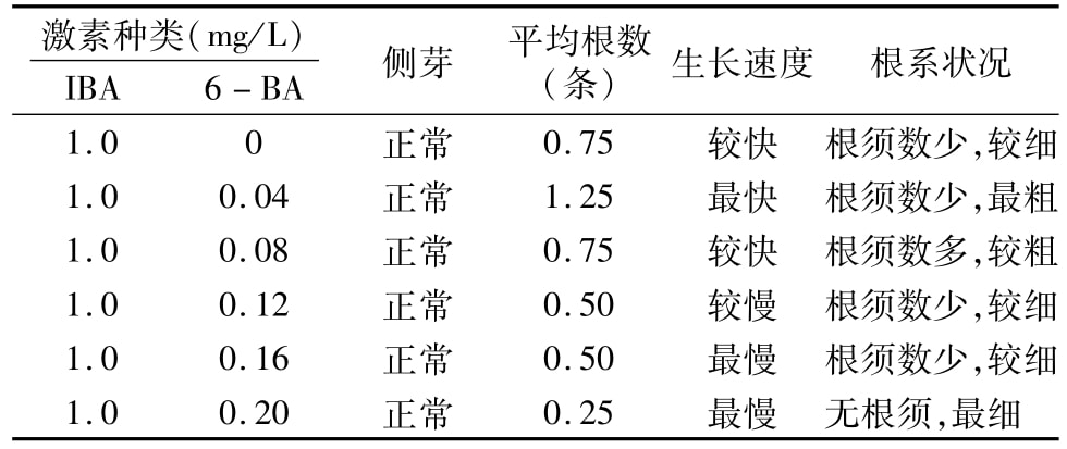 在IBA浓度为1.0 mg/L、6-BA浓度为0~0.20 mg/L时均有生根现象发生,生根状况佳的浓度配比是IBA 1.0 mg/L、6-BA 0.04 mg/L(表4)。在此生根条件下,所有节段均可产生侧芽,并可在侧芽生出15 d左右出现生根现象,即在这个浓度配比下,外植体均是先分化长出侧芽,然后在侧芽上长出新根。