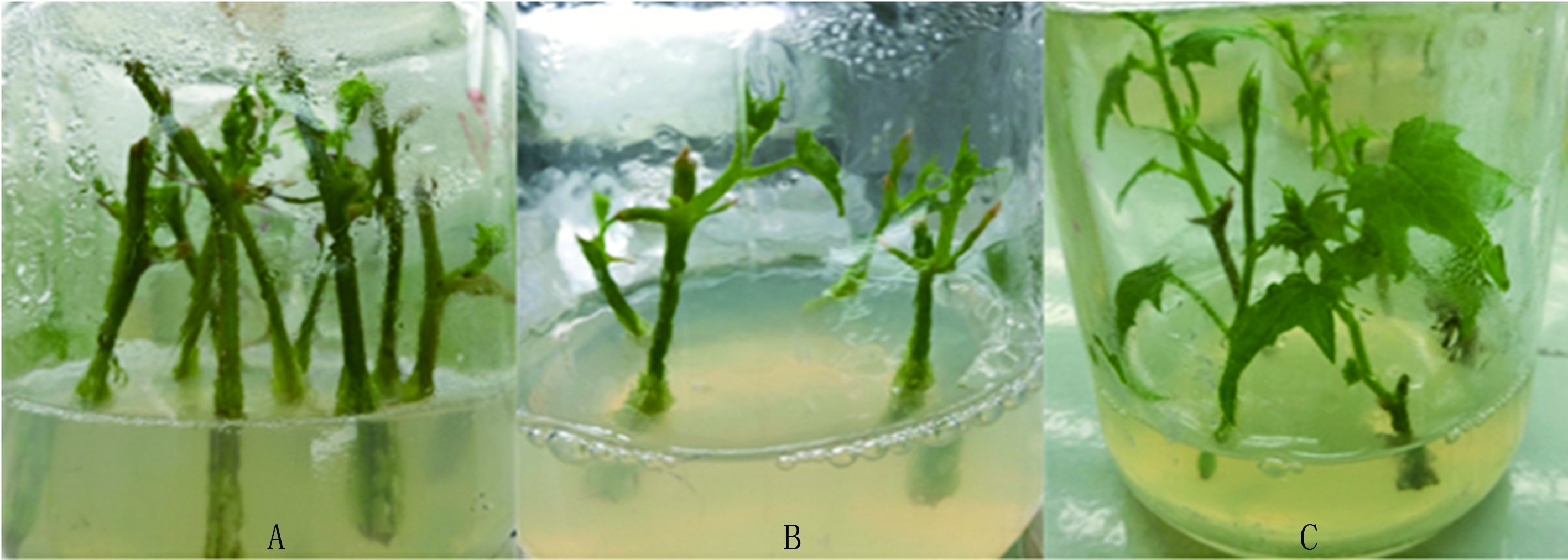 待初代培养基中腋芽长至4~5节带叶茎蔓后,将带叶茎蔓剪成一叶茎段,去掉叶子后接种到继代培养基中,每瓶接种5~8个茎蔓。观察不同继代培养基配方处理的茎蔓生长情况。