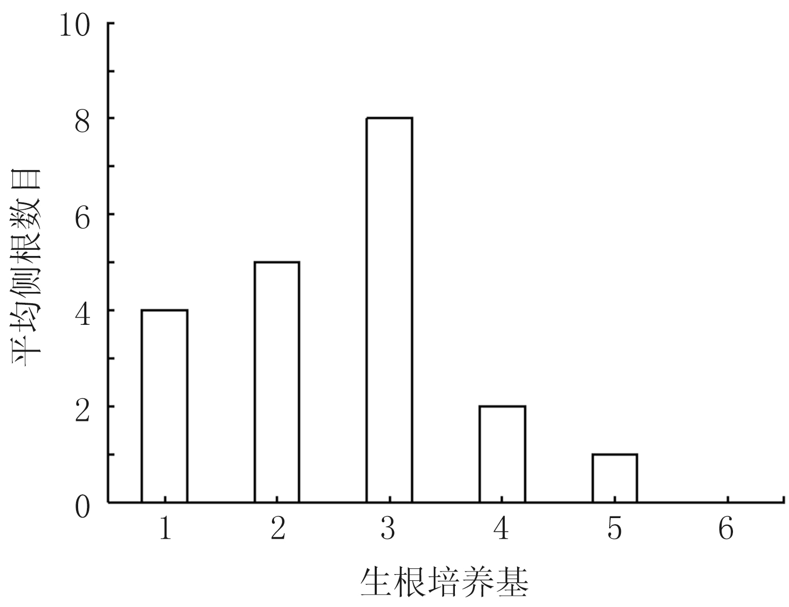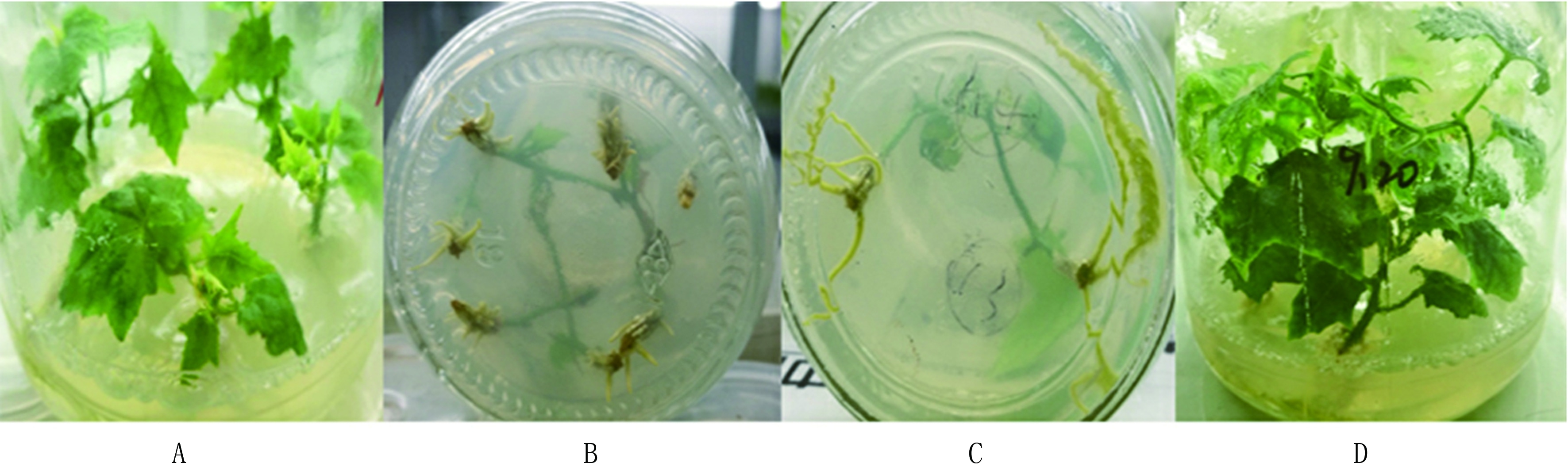 待继代培养苗长至6~8节后,将茎段剪下接种到生根培养基中,每瓶接种2~4个,诱导生根。观察不同生根培养基配方处理茎段的生根情况并测量根直径、平均侧根数目。