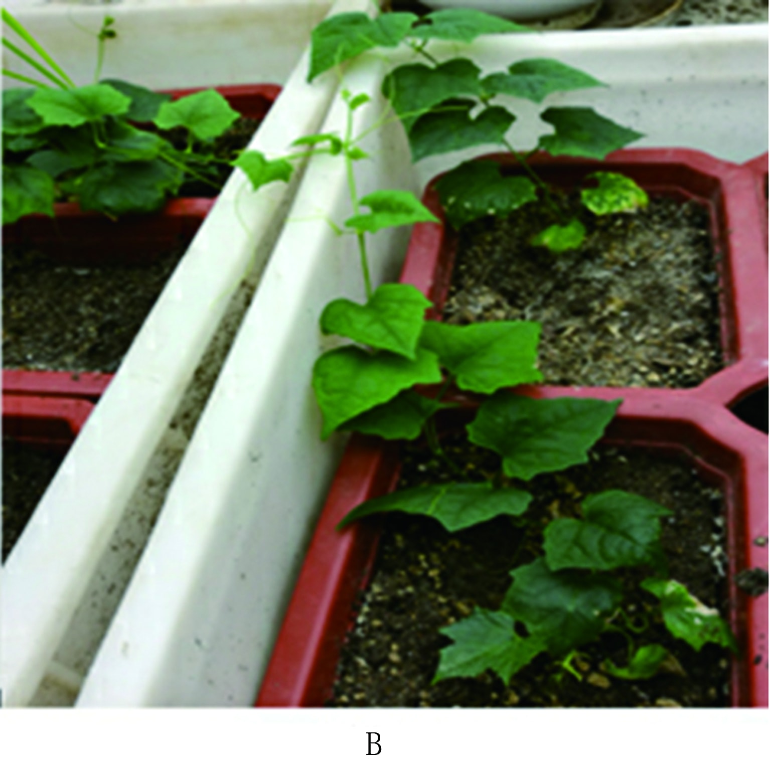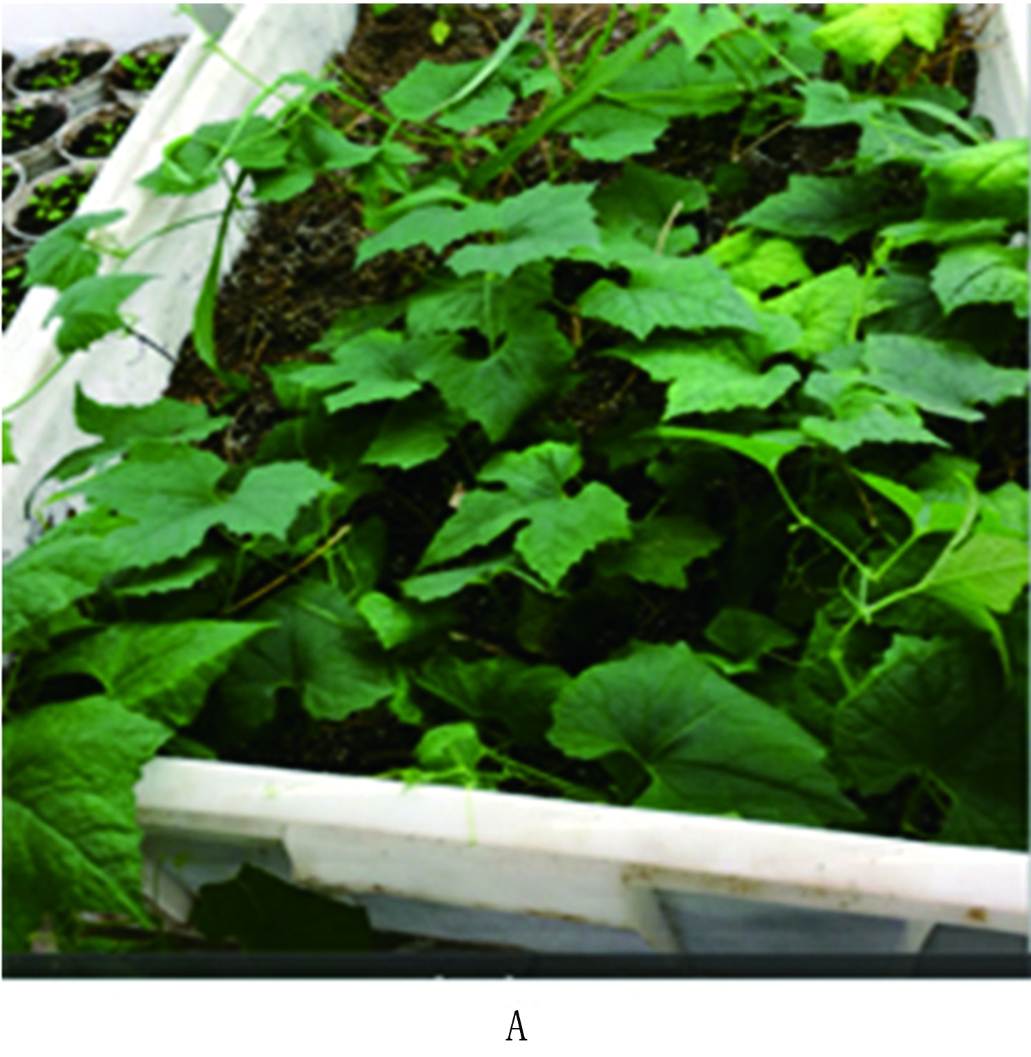 待吊瓜苗1个月后长至8~13节,主茎2~3 mm,叶片直径5~9 cm,新根增加,叶片形成蜡质层(图5 A)时,将其小心移栽至单盆中,也可以直接将幼苗移栽至大田中,移栽过程中避免损伤根部(图5 B)。经过炼苗移栽后幼苗成活率可达90%以上。