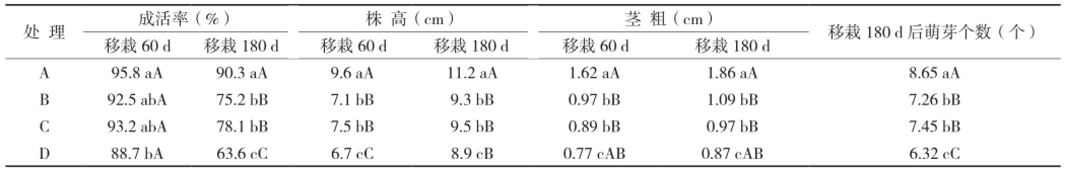 (4)基质配比:试验选用锯木、泥炭、蛭石、珍珠岩进行基质优化筛选,基质配比配方如下:A,锯木∶泥炭∶蛭石=1∶2∶1;B,锯木∶泥炭∶蛭石=1∶1∶1;C,锯木∶泥炭∶珍珠岩=1∶2∶1;D,锯木∶泥炭∶珍珠岩=1∶1∶1。锯木通过堆沤发酵处理,基质在使用前经高温消毒,用营养盘进行栽培,每种基质栽50株,分别于60和180 d后对植株株高、茎粗、萌芽数、成活率等指标进行观察。