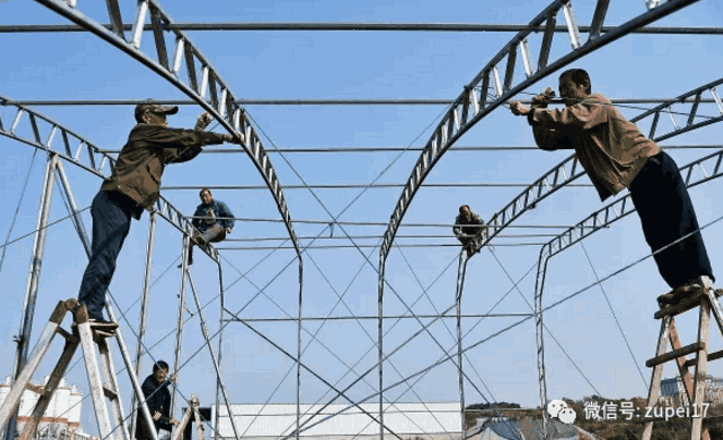 钢结构大棚,拱架是用钢筋、钢管或两种结合焊接 而成的平面衍架,上弦用16毫米钢筋或6分管,下弦用12毫米钢筋,纵拉杆用9—12毫米钢筋。跨度8—12米,脊高2.6—3米,长30—60米,拱眨1— 1.2米。纵向各拱架间用拉杆或斜交式拉杆连接固定形成整体。拱架上覆盖薄膜,拉紧后用压膜线或8号铅丝压膜,两端固定在地锚上。