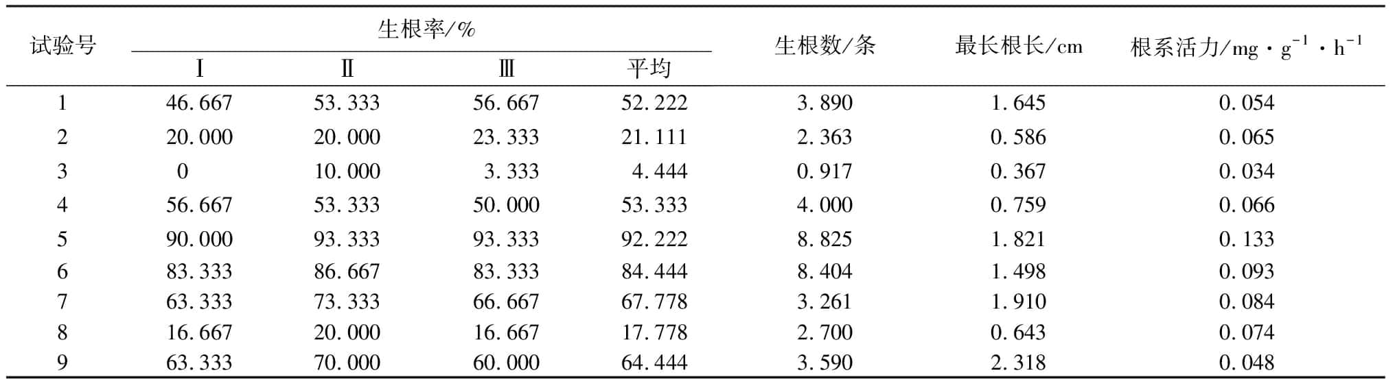 将基质装入49 cm×19 cm×13 cm的长形花盆中,选择生长健壮、长势一致的增殖苗,用剪刀剪去芽苗根部膨大部分,清水清洗根部,剪成长度约为3cm的茎段,根据试验设计分别对其进行生长调节剂处理,处理结束后用镊子将组培苗基部插入基质,深度为0.8~1.0 cm,覆盖薄膜保湿,膜内湿度保持在80%左右。置于温度25℃、光照2000~2 500 lx、光周期16 h的环境条件下培养,处理30d后调查统计各处理的生根率、生根数、很长根长,并进行根系活力的测定。