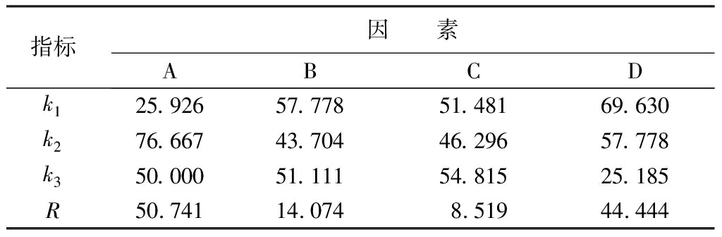 注:K为不同处理中各个因素对应的各个水平的数值之和;k为K的平均值;R为极差。