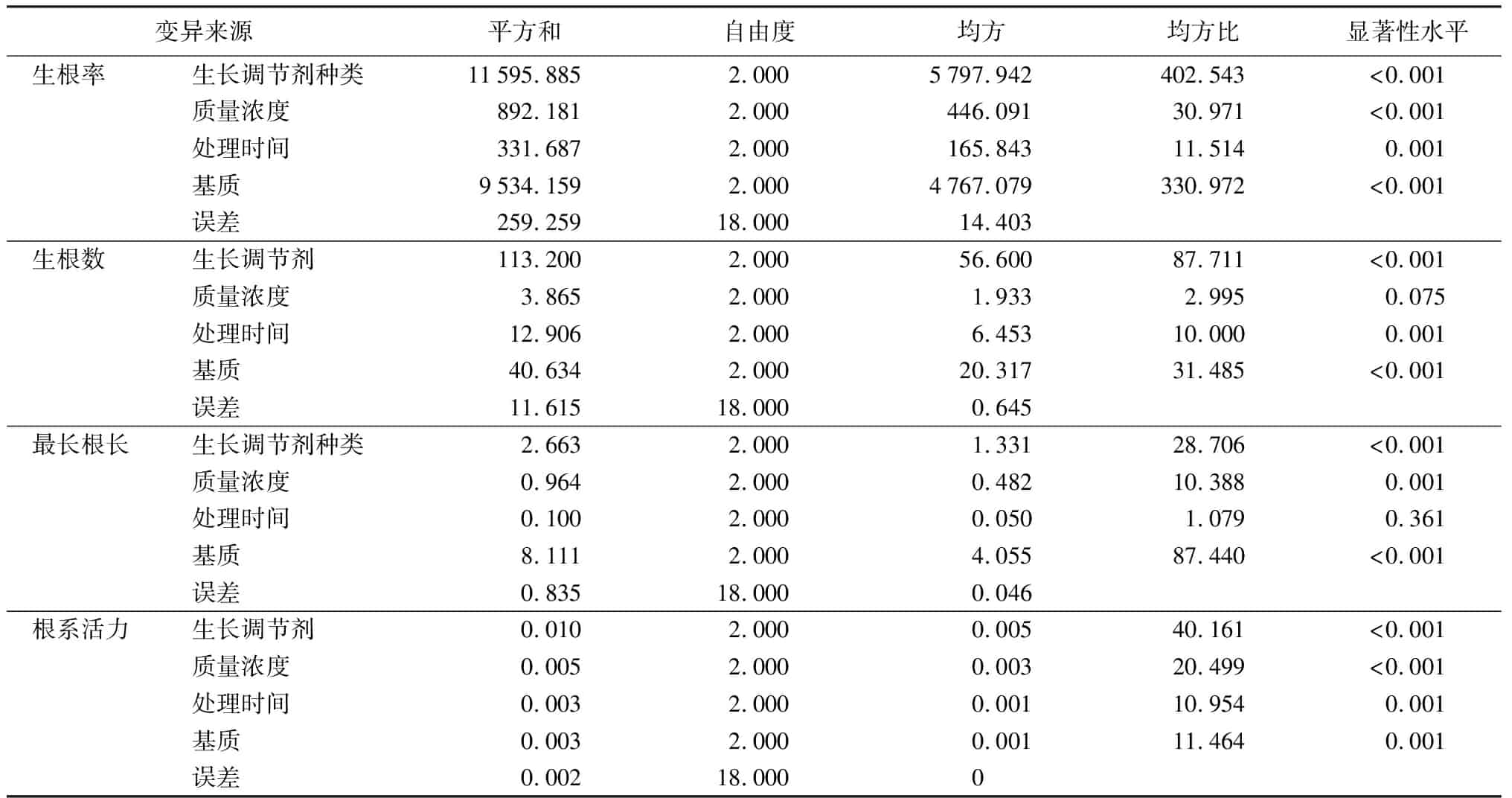 在根系活力方面,各处理因素下组培苗根系活力均方比由大到小顺序为生长调节剂种类、质量浓度、基质、处理时间,4个因素对根系活力皆有显著影响(P<0.05)(表4)。