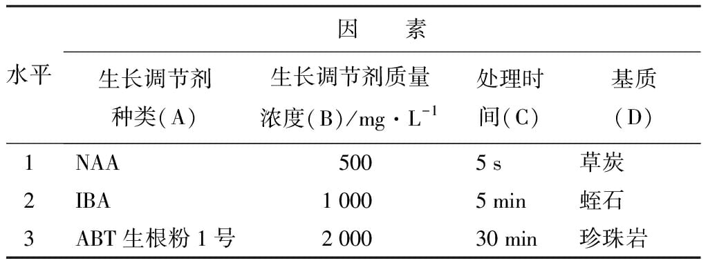 试验材料为江苏省林业科学院提供的轮生冬青‘奥斯特’组培苗。参考课题组前期对于乌饭树组培苗瓶外生根的研究以及在卫矛组培技术研究中的试验设计,采用L9(34)正交表,设置生长调节剂种类、质量浓度、处理时间和基质4个因素,每种因素3个水平,不考虑交互作用(表1)。随机以50根插穗为1个处理,共有9组处理组合,重复3次。