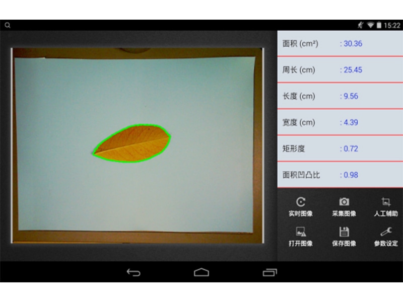 智能叶面积测量系统由图像采集仪和装入自主开发软件的平板组成,采用本公司多年积累的面积测量算法,根据叶片轮廓特征提取、图形实物转换、边缘检测等技术,能够形象并快速得到所测叶片面积、周长、虫洞数量等参数。相比传统的叶面积,具有测量更快速简便、结果更形象客观、数据多样并大大减少了人为操作带来的误差。